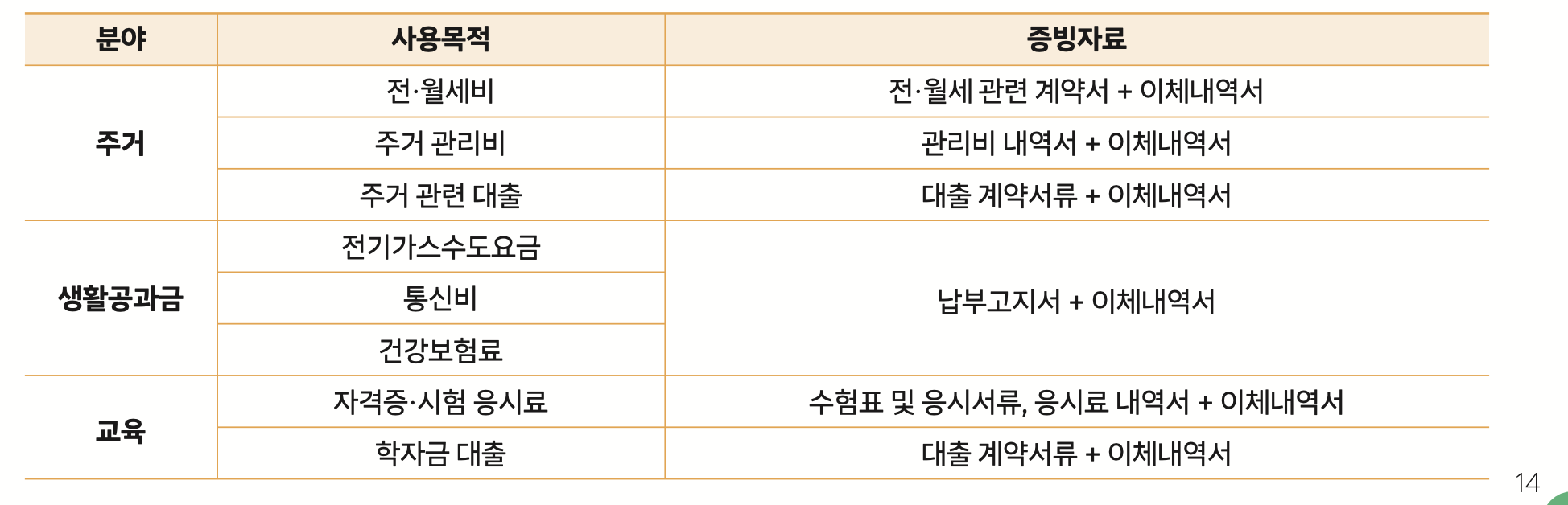 월세/관리비, 공과금 ・ 건강보험료(조세/연금 제외), 통신비(소액결제 제외), 식비, 교통비(해외항공권 제외), 의료비(질병 치료 외 미용 목적 제외), 생활용품 구입비 등