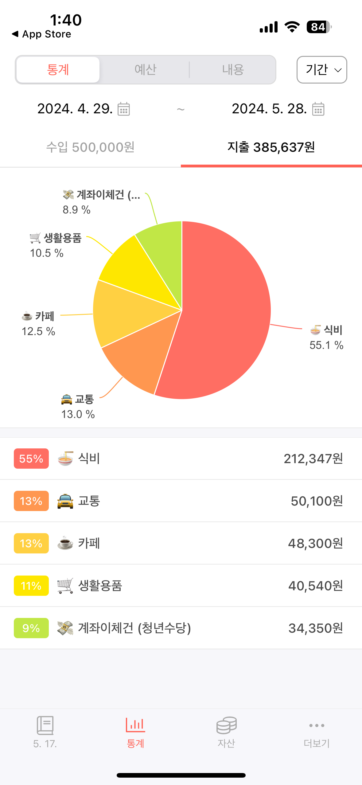 청년수당 참여자는 매달 자기활동기록서를 작성하고 제출해야 하는데, 그 기간이 이번달은 5월 15일부터 6월 10일까지이다. 2회차 청년수당 지급일이 5월 29일이니 4월 29일부터 5월 28일까지 사용한 금액을 비율별로 작성해 제출을 해야한다. 이걸 작성하기 위해 나의 지출 내역을 다 다시 살펴보기는 귀찮을 것 같아서 처음부터 가계부를 작성하기로 했다. 😎 몰아서 하면 일이지만 꾸준히 하면 습관이 되고, 습관이 되면 전혀 귀찮지 않고, 일도 아니다.!