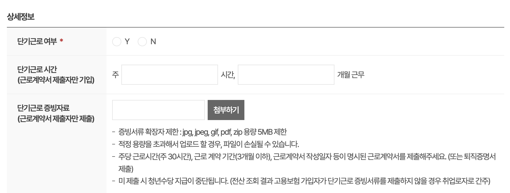 - 단기근로 여부 / 단기근로 시간 / 단기근로 증빙자료