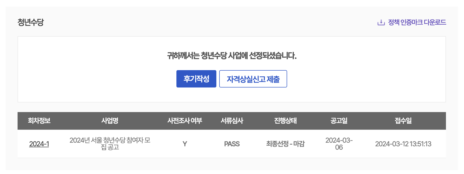 [서울시 청년수당] 청년수당 자기활동기록서 2회차 (전세자금대출 이자납부 증빙자료 제출 / 6월의 청년수당 사용기 기록) (0) | 2024.06.28 |