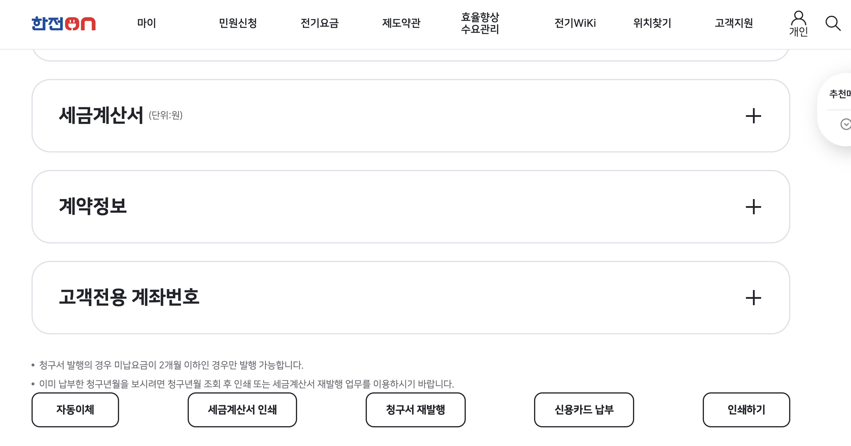청구서 재발행 : 한전ON > 마이페이지 > 해당 월의 요금조회/납부 > 맨 아래 청구서 재발행