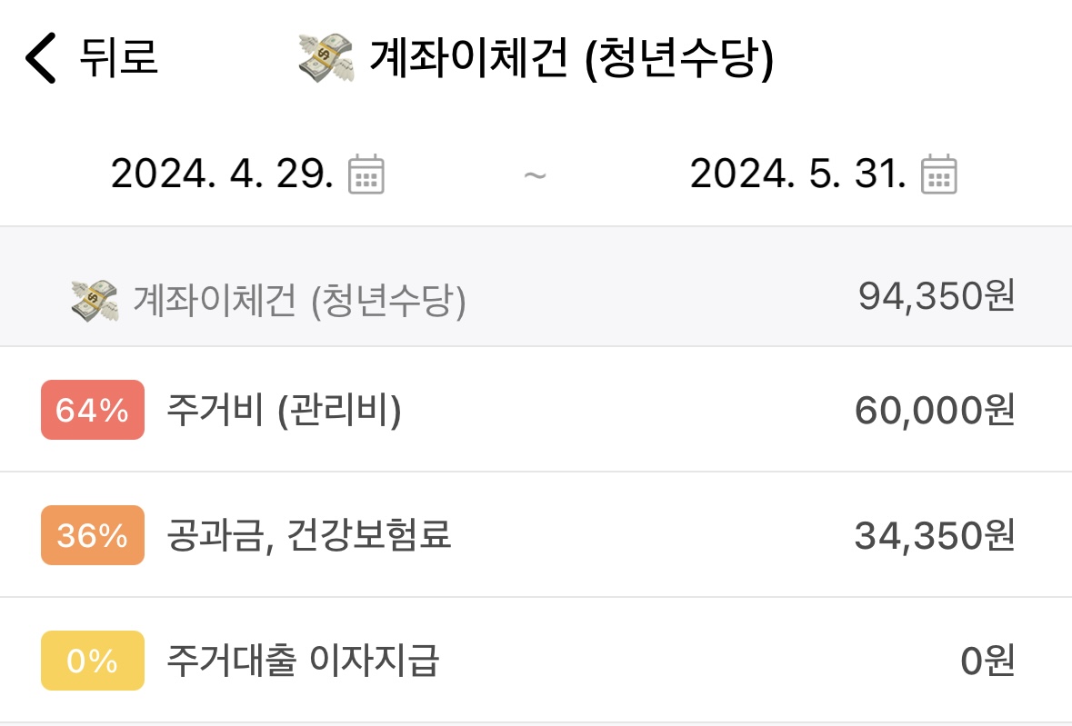 | [서울시 청년수당] 청년수당 사용계획 및 사용 후기 / 가계부 어플로 한눈에 지출 파악하기 (2) | 2024.05.17 |